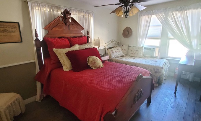 The Red Room at the Inn has a beautiful Full size walnut bed and a twin as well. The private bathroom has a clawfoot tub and makeup vanity. It is located in the upstairs of the inn with 4 other rooms. Our quaint parlour area hosts, coffee and snacks as well as a wonderful place to sit and relax.