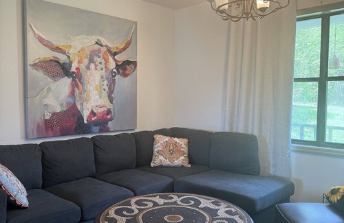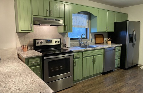 Located on 1.7 acre of farmland in the rolling hills of North Georgia, the Cumming Duck Farm House sits above a peaceful pond overlooking a farm. This is a great getaway from the City for couples or a family. 40 minutes from Buckhead Atlanta, 5 minutes to upscale local shops and restaurants, and 10 minutes to rural antique collector shops and family farm activities, this relaxing cabin retreat provides a refreshing recharge of the body and mind. Take it easy at this unique and tranquil getaway. A charming farm gate welcomes your arrival. Open uncovered parking can accommodate up to 6 cars. The Cumming Duck Farm House has an open floor plan great for families or work retreat. Get a fresh cup of Kuerig-made Starbucks coffee every morning and watch TV on our brand new 55 inch 4K UHDLED Toshiba Fire TV with upgraded high speed1Gbps Broadband Internet and wifi throughout the property. The cabin house includes the Pekin Suite (bedroom 1) with a King Bed adjacent the Pekin Bath (private bathroom), and 2 spacious bedrooms (the Mallard Room and Widgeon Room) each with a Queen Bed, with access to an adjacent to the Duckling Bath (a full bathroom). The Gathering Room (our living area) is a large open area for dining and entertaining, with a sectional sofa, coffee table, lamp, wine refrigerator, new Room and Board 72” x 30” walnut top table and 6 farmhouse dining chairs. These areas open into our fully-equipped Farm Kitchen and the Pastoral Deck overlooking lush farm pastures and a nearby pond. The House is fully furnished with an eclectic mix of modern and farm house decor, and the Pastoral Deck is also furnished with a porch swing and cushioned seating for evening conversations. Our Pastoral Deck includes a Big Green Egg grill and Yeti 45 cooler for your outdoor enjoyment. We also have Solo Bonfire 2.0 fire pit and outdoor furniture setup for sitting in the pasture watching the stars and moon rise over the farm. The Farmhouse Kitchen is fully equipped with an electric range and oven, pots and pans, plates and dining ware, refrigerator / freezer, convection toaster oven, Keurig coffee maker, crockpot, and hot water kettle. An ample portion of the 1.7 acre property adjacent to the house and driveway is fenced.