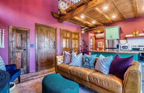 Back inside, the master bedroom is on the main level and outfitted with a king bed and it's own flat screen, smart TV! The only bathroom is plenty spacious and features a floor to ceiling tile shower! Head up the wrought iron staircase to the open loft with two queen beds and beautiful views of the trees! This "Tree House" is sure to be a one of a kind experience!