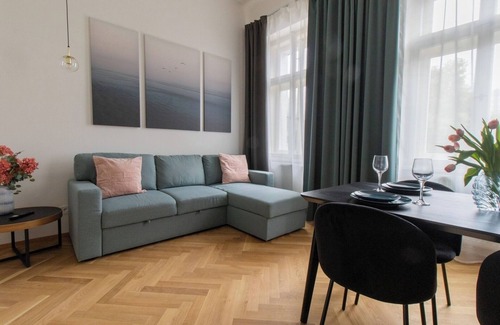 Experience comfort and style in this modern flat very close to the centre, perfect for couples, families, or business travellers. Relax in a cozy living area with chic decor and natural light, enjoy meals in a fully equipped kitchen, and unwind in a tranquil bedroom with a king-sized bed. Located minutes from Prague's top attractions, this is your ideal retreat to explore the city's charm and culture. Book now!