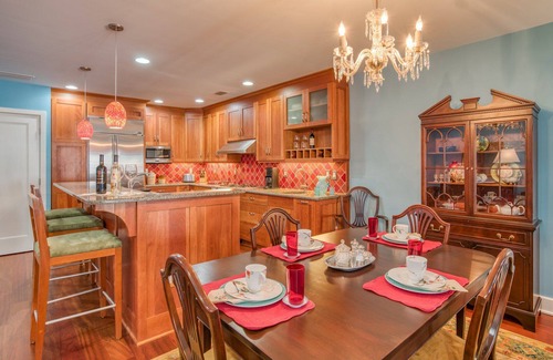 Luxe furnishings surround you inside this spacious 1600 sf apartment which features a large gourmet chef's kitchen. The fully-stocked kitchen has an oversized bar and is open to the dining and living areas. These areas together serve as a great gathering space and also open up to the balcony over St. George Street which extends the width of the apartment and is a great place to enjoy a glass of wine and watch the passers-by. Experience hardwood floors, high-end European style furniture with modern touches and lush color palette throughout the apartment, and fully involved cable TV in the spacious living area. The Master bedroom, with adjoining Master bath, is at the opposite, quieter end of the apartment facing Spanish Street. Between the Master and the living areas is a second bedroom with two twin beds, and a hall bath. Both bathrooms are outfitted with modern finishing, plush linens and sauna showers, and the Master bath also has a luxury 6 foot whirlpool bathtub with champagne bubbles. Rest well after a day of exploring in beds that are dressed with sumptuous all-cotton linens.