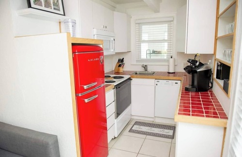 This dog-friendly, cozy single family home cottage sits in the middle of a laid back beach neighborhood amongst a well-known coffee shop, putt-putt golf course, neighborhood bar with live music (next door at Mahuffer's), and other beautiful homes. Watch sunrise and/or sunset from the rooftop, BBQ on our grill, cook your favorite meal in the fully stocked kitchen, take our bikes for a ride, toss in a load of laundry in the washer and dryer, watch our selection of movies, and simply walk across the street to the private beach access at Sunburst Inn, as seen on HGTV. There is one bedroom with a queen size bed and a sleeping area in the living room with a trundle bed that sleeps up to two.