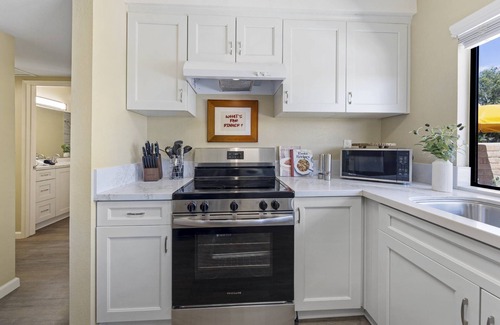 This home features a newly renovated living room with a generous sectional sofa, a large screen smart TV perfect for movie night with family and friends. A computer desk sits in a well-lit front window. The dining comfortably seats up to six (6) guests. The kitchen has a pass-through to both the dining area and front patio. Laundry access in the main hall.