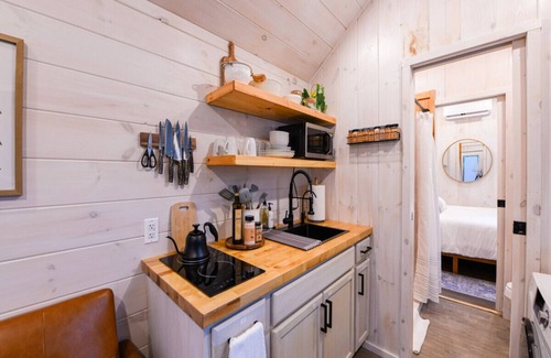 The Magnolia Mini is an adorable, brand new tiny house just a 5-minute walk from Downtown Norcross, GA. It has large windows, lots of natural light, a tiny but well-equipped kitchen, a washer/dryer, mini-fridge, 55" TV, and a pull-out sofa that can sleep 1. The Magnolia Mini can sleep 3. There is a private outdoor bistro table for your use, and a shared backyard space complete with a fire pit & hammock. Families and children are welcome; pack n'play and high chair available upon request.