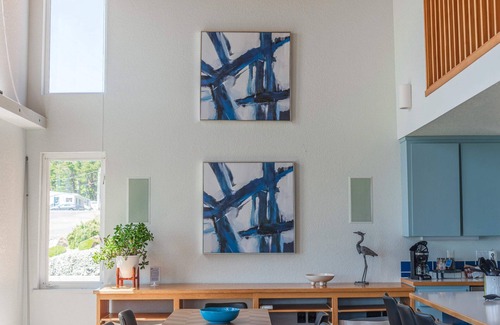 The Mid- Level (located on the 2nd level) Living area is furnished with a large comfortable sectional with plenty of seating for a large group. Flat screen Smart TV set up for Roku streaming with WIFI. Relax and enjoy an evening catching up on your favorite episodes or snuggle in and read a book while watching the sunset. Gorgeous views, and a wall of windows in the living area make it a nice place to relax and take in the scenery! There is also a desk and lamp for working from home.