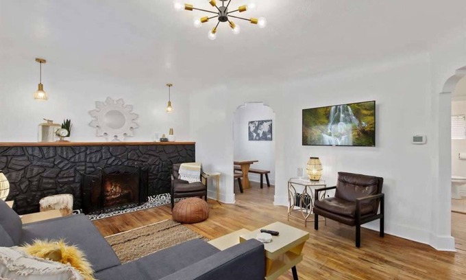 #StayinMyDistrict Twin Falls Convenient to Downtown, College of Southern Idaho, local shopping & dining. Newly updated Tudor Style, featuring modern finishes with a mix of Bohemian & Spanish Charm. 4 bed/2 bath, Cozy living area with fireplace and pull out sofa bed, Kitchen & Kitchenette, Basement Family Room. Amenities & contemporary style make this the perfect HOME away from HOME! Sleeps up to 10. Laundry, Private fenced yard, outdoor seating & gas firepit. Driveway for up to (2) vehicles.