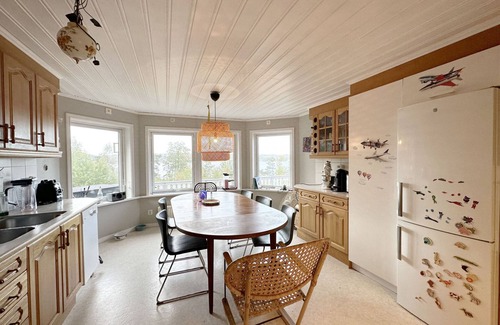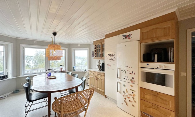 Elevated holiday home in hilly terrain with a magical view of the Borgilefjorden and Bohuslän's beautiful coastal landscape. The house contains a large well-equipped kitchen with many work surfaces and a dining area for a large family.