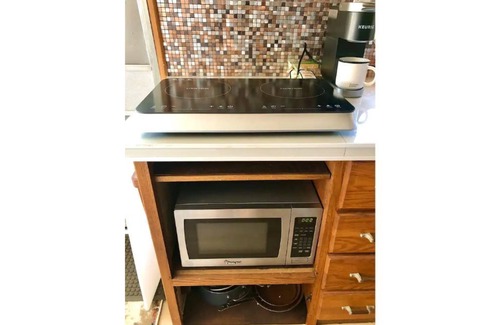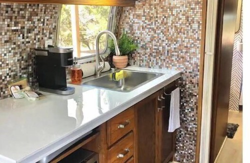 Step inside to the Steel Magnolia Airstream and you'll find two comfy chairs in the living room area that fold into twin beds (perfect space for watching netflix on our smart tv), a queen size bedroom in the back, brand new bathroom with small shower with removable shower head nozzle, beautiful remodeled kitchen with refrigerator, freezer, induction stovetop, full size sink, keurig coffee maker, microwave, pots, pans and dishes for four! There are divider curtains at either side of the bathroom to make it much more roomy and spacious while using the restroom, showering or getting ready. BUT since they are only curtains, you'll be very close and personal while using the toilet/shower. Ideally suited for families with kids and/or one couple. Has outdoor deck with 4 barstools, private propane fire pit with chairs and a relaxing hammock too!
