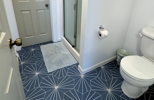 The lower level flat is fit for one or two guests, featuring a queen bed, single bathroom, and kitchenette.