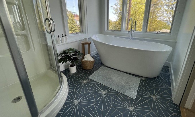 - The Steeple Hill Flats offers two modern suites nestled into the Bayfield hillside overlooking downtown and the breathtaking Lake Superior. Both the Superior Flat and Lower Flat feature Southeast facing windows with gorgeous views and walkout to private decks. The entire interior recently received a full facelift and was completely renovated with upgraded, state-of-the-art materials including engineered wood flooring and fully tiled bathrooms. Enjoy the brand-new, oversized soaking tubs that give both of these spaces a relaxing, luxurious feel.