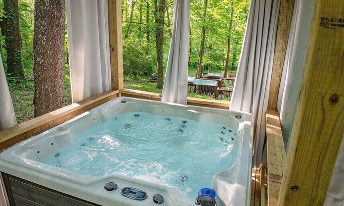 Stefan Cabin at Wauhatchie Woodlands is a cozy, tiny cabin located just 5 minutes from downtown Chattanooga. It offers access to a private hot tub under a cabana with curtains, a furnished back deck, and a covered front deck with a charcoal grill. In addition, there is a shared fire pit for you to enjoy during your stay. The natural surroundings are incredibly charming and memorable. With a main bedroom and a sleeping loft, Stefan can comfortably accommodate up to 4 guests.