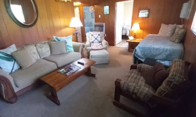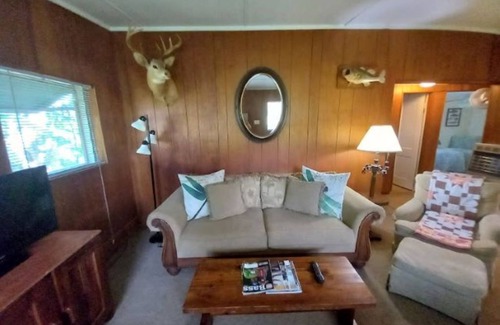 Pine paneling, mounted buck and bass on the living room wall, large capacity window air conditioning and additional one in the kitchen, and gas heat provide all-around comfort. A picnic table right outside allows a great spot for cook-outs. Pets friendly. See website for policy.