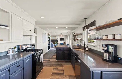 Stylish kitchen in shades of blue & white. Huge quartz counters with gas Airfryer oven & dual washing sink.
