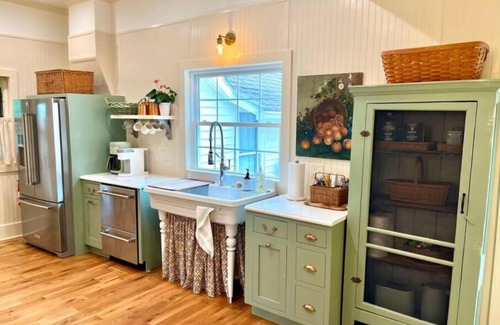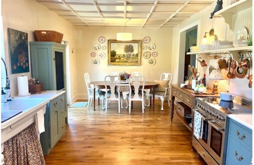 At the heart of the home is the show-stopping farmhouse kitchen—a design-lover’s dream. This beautifully curated space blends old and new with effortless charm, featuring mismatched copper accents, an oversized farmhouse sink, and wide-plank white oak floors. Every appliance is thoughtfully selected to meet the needs of a master chef, and beautiful English dishes add a playful, elegant detail. Through a set of French doors just off the kitchen, you can step out onto the deck to enjoy an à la carte meal with garden views, dine al fresco under the open sky, or sip iced tea while lounging on the classic wraparound porch. For a truly dreamy countryside moment, take your gourmet meal out to the white garden for a picnic under the trees or unwind in the hammock with a glass of wine and the sounds of nature all around. Whether indoors or out, the kitchen is the heart of connection, comfort, and style—like stepping straight into the pages of a magazine.
