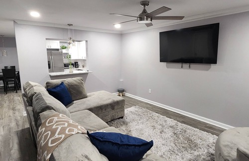 Newly renovated one bedroom (king size) one bathroom corporate apartment with separate entrance. The apartment includes a 50-inch smart TV in the bedroom and a 65-inch in the living room area with high speed wifi. Netflix, Hulu, Disney+, ESPN, & Roku are available to watch. Enjoy your stay. There is also a coffee/tea bar, water, and a variety of soft drinks to enjoy. We are 11 miles from the Mall of Georgia, 1.7 miles from Rabbit Hill Park, and 7 miles to Gwinnet medical.