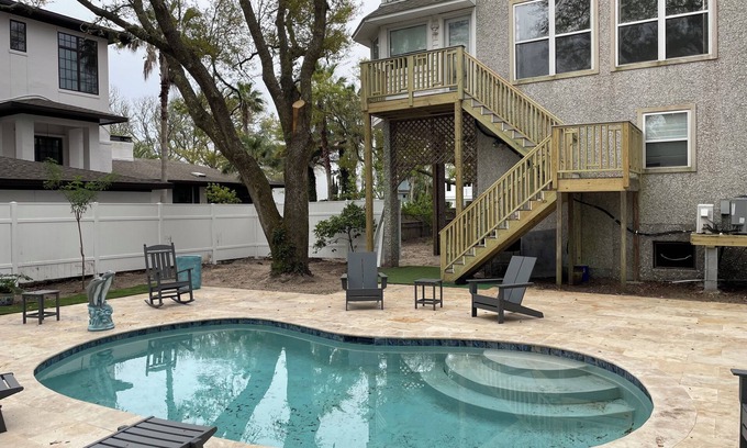 Seaside Grove, a five (5) bedroom beach house with a backyard Oasis featuring a new pool and spacious play area. This home is just steps away from the well sort after East Beach on St Simon’s Island. Endless entertainment spaces, including 2 decks with ocean view and 1 with outdoor-bar. Large yard with orange trees for outdoor activities. This spacious home sleeps 12 adults and up to 14 -15 with children great for family getaway. Just tell us your guest plan and needed sleeping arrangements and we will do our best to make your stay comfortable.