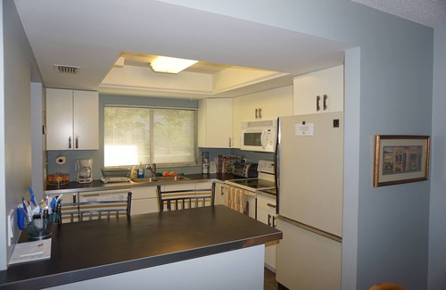 Downstairs features - Newly remodelled kitchen * Living area - comfortable furniture including a loveseat that makes into a twin bed, sofa bed that makes into a queen sized bed, glider rocking chair, NEW 55 INCH SMART TV, DVD player, dining table and chairs, ceiling fan * Half bath * Wet bar * Lanai * Outdoor patio area * Kitchen with all new cabinets and countertops, newly tiled, dishwasher, microwave/air fryer, stove, refrigerator. Recently renovated to open up the kitchen to the living area. Other features include conveniences such as a CrockPot, mixer, coffee maker, George Foreman grill and Belgian waffle maker. Fully furnished with dishes, silverware, pots and pans. Everything you need! Or just eat out at one of the great local restaurants! Stack of menus provided!