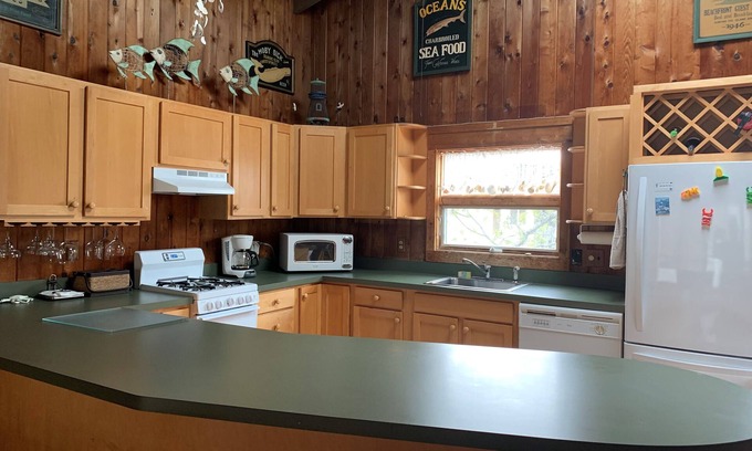 The outdoor wraparound deck has bench seating, a large picnic table, refrigerator, and large Weber grill. There is plenty of space to lounge, sunbathe eat and play. The large picnic tables seats 12 easily! Relax and enjoy the flowers, fresh air and ocean breeze.