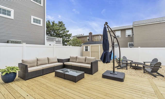 First floor offers an updated kitchen, dining area, bathrooms and large family room. Large spaces for family gatherings. Kitchen seating can fit up to 10 people. First floor offers 1 bedroom and 1.5 baths. Second floor offers 3 bedrooms with full bath with tub. There is also a collapsible crib on the 2nd floor. Large open backyard for entertaining with tables, chairs, and direct line gas grill. Outdoor shower is perfect for rinsing off after a great day at the beach.