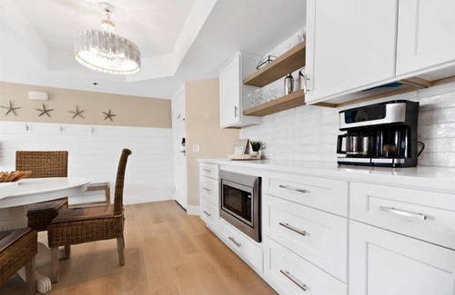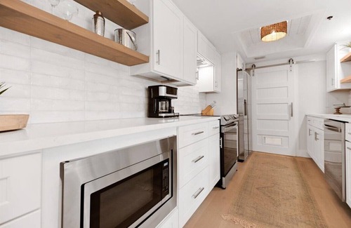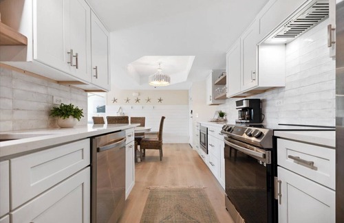 Your luxury St. Simons Island rental features a newly renovated interior, glowing with natural light and a welcoming ambiance. Relax in the bright living area, complete with plush furniture and a large SmartTV for movie nights. The modern, fully-equipped kitchen includes stainless steel appliances and a breakfast bar, leading to a quaint dining area. Step out onto the balcony to savor a cup of coffee and stunning Golden Isle sunrises.