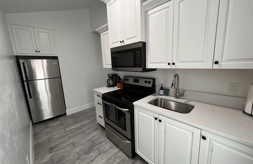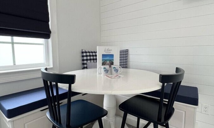 Our nautical-inspired cottage accommodates up to 6 guests with 2 comfortable queen-size beds and a queen-size pullout sofa-bed, along with a beautifully tiled bathroom with a walk-in shower, complete with towels and all the toiletries you need throughout your stay. The unit includes a dining area and an equipped full-size kitchen with quartz countertops, stove, oven, refrigerator, microwave, and all the necessary cooking and dining utensils, so it's perfect for enjoying home-cooked meals.