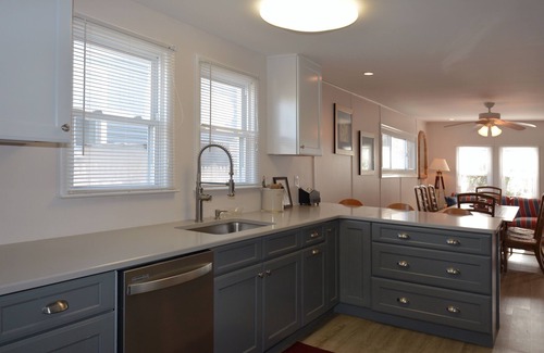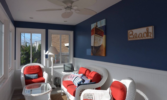 Private parking for two cars is included, along with amenities such as an extra refrigerator, washer and dryer, ceiling fans, Wi-Fi, central air conditioning, dishwasher, and a gas grill. After a day in the sun, rinse off in the outdoor shower. One first-floor bedroom with two twin beds is located on an enclosed, air-conditioned porch, offering a cool, comfortable retreat.