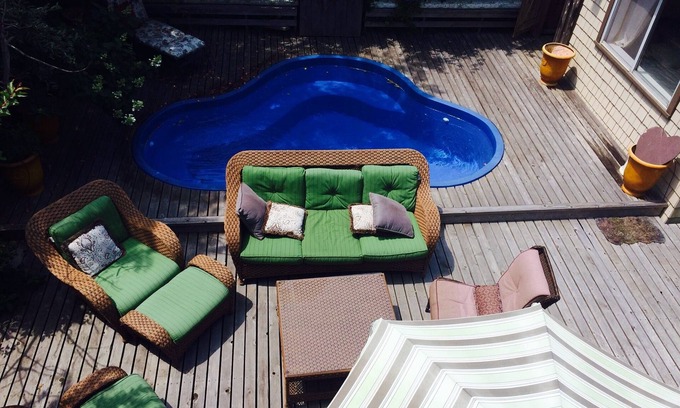 Outside: features a very private sunny deck including a pool, a gas Weber grill, outdoor dining and lounge seating. All fenced in.