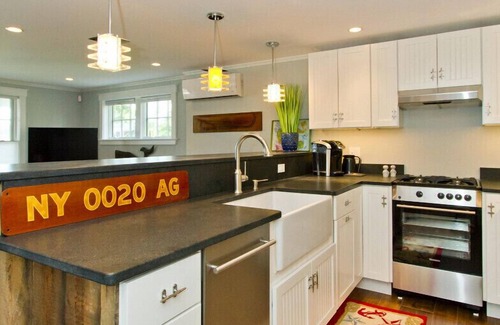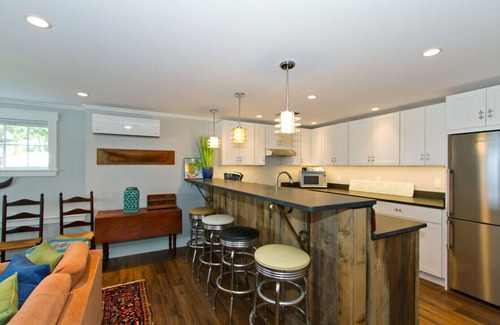 The Boathouse unit is on the ground level facing the harbor with lovely views. The open lay out offers much charm with open kitchen, bar/dining area, and living areas. Queen bedroom with authentic barn board decor and high end bathroom with tile shower and neat port hole window emphasize the fun and playful feel of this unit.