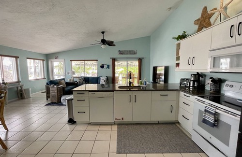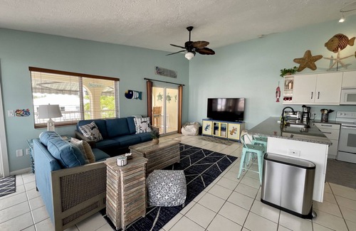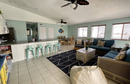 Come inside to a cheerful and spacious open concept living area. New couches, large smart TV, Comcast cable, high speed internet and WIFI. Well appointed and stocked kitchen with large granite counter top and four stools. Two large pantries to secure all your groceries and goods. Dining table for 6 for your family meals. All decor is fun, cheerful and coastal.