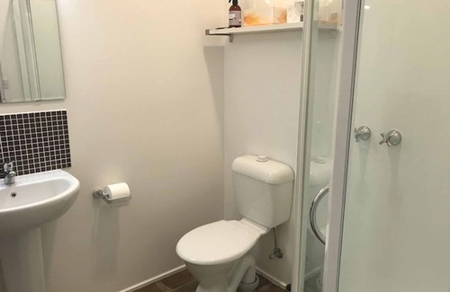 Fully equipped bathroom with shower, toilet & vanity