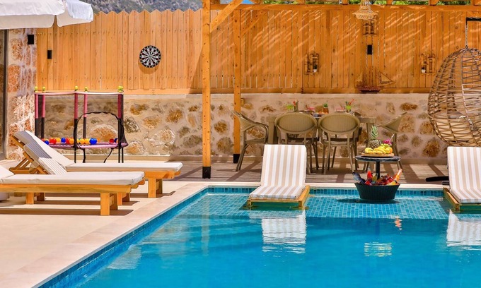 Our villa, located in Kalkan Sarıbelen, provides an ideal holiday opportunity for honeymoon couples and nuclear families. Our villa, which has a special stone architectural design, has many features that will make you happy, such as a sheltered private swimming pool, jacuzzi, children's pool, children's playground and barbecue area.