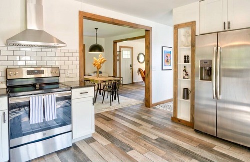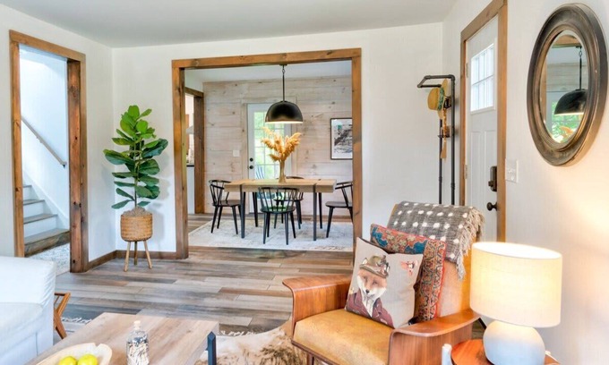 The peaceful 1938 saltbox home is surrounded by beautiful gardens and a large tree-lined lawn. Enter the fully renovated hideaway to find a modern yet rustic palette of neutral colors and breezy textures, perfect for relaxing after a day exploring the nearby Delaware River and trails. The main floor of the cottage is ideal for cooking, dining, and lounging with an open-plan living room, dining room, and chef’s kitchen that opens onto a large deck and flagstone patio, complete with garden views and a gas grill.