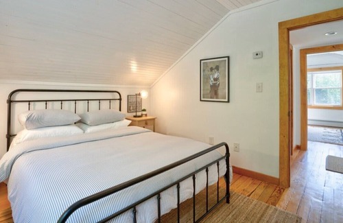 The cottage’s charming upper level features original wood floors, pitched white wood ceilings, and two bright bedrooms both with queen sized beds. This thoughtfully appointed home satisfies those looking for connectivity through excellent WiFi, and streaming entertainment.