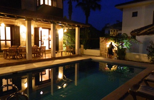 Villa Baykus is a beautiful stone built villa within 10 minutes walking distance of the centre of Dalyan. It has a very quiet location with stunning views of the mountains. There are three air conditioned bedrooms all with ensuite facilities. Two rooms upstairs are double bedded rooms with balconies overlooking the pool and mountains beyond. Downstairs is a large bedroom with a double bed,single bed and a large bed settee.