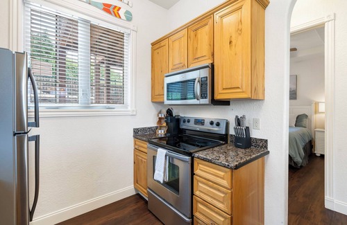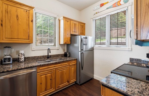 The home’s interior has been artfully decorated and comfortably furnished with your ultimate relaxation in mind. Spacious rooms with an abundance of natural light create an ambiance of calm, where you can kick up your feet and let your outer worldly cares wash away. The living room features comfy sofa and armchair seating facing a cozy electric fireplace and large mounted smart TV. All entertainment is at your fingertips should you partake in a movie or televised sporting event. The nearby dining room table offers seating for 4, while additional seats at the counter offers room for 2 more. A well-equipped kitchen offers all standard appliances, cookware, and dining ware that can cater to any type of meal.