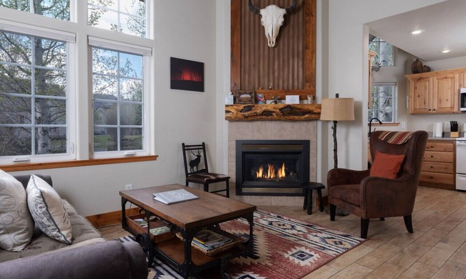 This two-level townhome is the perfect home away from home where you can relax in a beautiful mountain setting, while still having access to all the conveniences you are accustomed to. The kitchen opens into a large living area with combined living/dining spaces. The southwestern decor ties together this house and, combined with a flowing, open layout, contains seamless transitions between areas that makes for a high accessibility and connection between rooms.