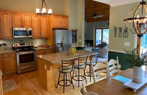 Newly renovated in 2023, this gorgeous home features a spacious open layout with water views from almost every room. The fully stocked kitchen boasts an electric cook-top, breakfast bar with stools, and a large walk-in pantry equipped with small appliances such as a crockpot, electric griddle, electric skillet, and blender. Gather around the large dining table with a built-in leaf, accommodating up to 10 guests comfortably.