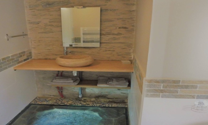 This renovated house consists of a living room of 25 m2 with a seating area overlooking a private terrace, a kitchen and a dining room. In the extension, you have a room of 20 m2 with an adjoining bathroom with a walk-in shower. You will be surprised to discover in the bathroom an old glass well over 200 years old, still in use. Note that the chaise lounge can serve as extra bed (90 x 200) for an additional person, sheets not provided.