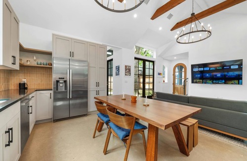 Introducing an INCREDIBLE Storybook Tudor home. This unique home on the vibrant East Side blends 1920's/30's architecture with modern allure and features 2 Bedrooms & 2 Bathrooms accommodating up to 4 guests. Step onto the gracious porch overlooking an enchanting courtyard, surrounded by lush elm trees. Inside, the great room astounds with soaring ceilings, abundant natural light, and French doors. Unwind and rejuvenate in the small plunge pool, the perfect oasis for soaking up the Texas sun and cooling off on hot summer days. Whether you're lounging poolside with a refreshing drink or taking a refreshing dip, the tranquil atmosphere of the backyard provides the ideal setting for relaxation and rejuvenation. This charming vacation rental has everything you need for an unforgettable getaway. Book your stay today and Stay Awhile, making memories to last a lifetime!