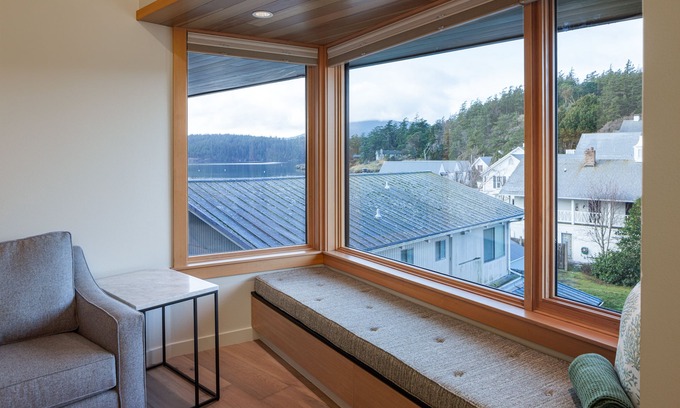 Luxury King Hotel Room plus double sofa bed with partial water view of Eastsound Bay and surrounding Village of Eastsound on Orcas Island, WA
