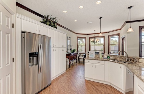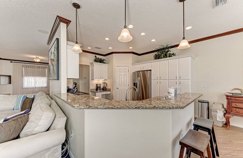 Step into a peaceful paradise where the outdoor living is just as inviting as the indoors. The screened lanai surrounds your private heated saltwater pool and spa, complete with loungers, an outdoor shower, and a stunning outdoor kitchen featuring a built-in gas grill, sink, mini fridge, and ice maker. Dine al fresco with seating for 8 under the warm Florida sky, or relax beneath the gazebo nestled in the serene backyard garden. Guests will also love the Putt-Putt Golf.