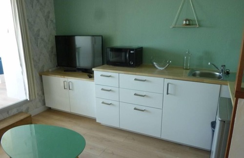 In a residence with swimming pool and tennis court, sea view studio for 4 people located on the 1st floor of a small building. It includes: a loggia, a living room (140 cm sofa), fitted kitchen area, a bathroom with WC, a sleeping area with 2 single bunk beds.