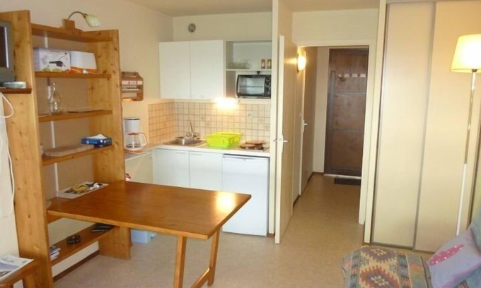 In a residence with swimming pool and tennis court, sea view studio for 4 people located on the 1st floor of a small building. It includes: a loggia, a living room (140 cm sofa bed), fitted kitchen area, a bathroom with WC, a sleeping area made up of 2 single bunk beds. (out of season: electricity consumption extra).
