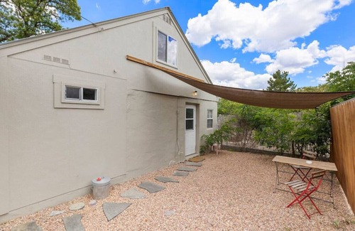 Studio 410 is a tiny hideaway mere blocks from downtown. You feel like batman as you drive down the alley and pull into your own secret covered parking! Enjoy your shaded outdoor area surrounded by a privacy fence or chill out in the studio’s living area. There’s a small kitchen with everything you need for light cooking as well as a charcoal grill. The cozy sleeping loft is up a ladder, it has windows, a window unit ac and a queen-sized bed.