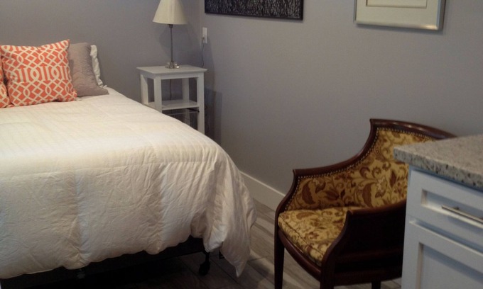 The Apartment features a Queen Bed, full bathroom with shower/tub for soaking, kitchenette, kitchen table and stools, 32" TV, and internet.