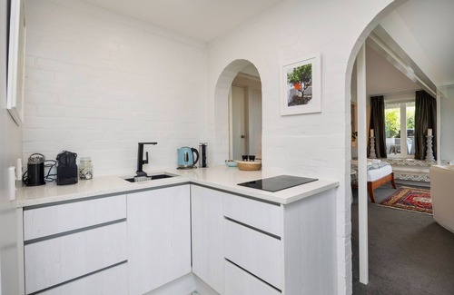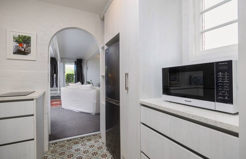 Our unique Ground Floor Studio has a refreshing eclectic Mediterranean theme, with Turkish influenced floor tiles, whitewashed textured brickwork, and gorgeous arched openings between the spaces. Guests enter via the apartment's private front door and into the entrance hallway where the bathroom and kitchen are located. Once through the kitchen and into the main living space, guests are greeted with beautiful ocean views, and then out onto the patio with BBQ. The arched openings provide good separation between the kitchen and living space. The kitchenette contains a fridge/freezer, double cooktop, microwave, kettle, toaster and Nespresso machine. The laundry is conveniently tucked away in a separate room.