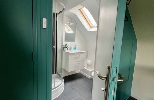 La salle de bain dispose d'un sèche serviette, d'une grande douche ainsi qu'un meuble vasque avec miroir éclairant. un sèche-cheveux est à disposition.