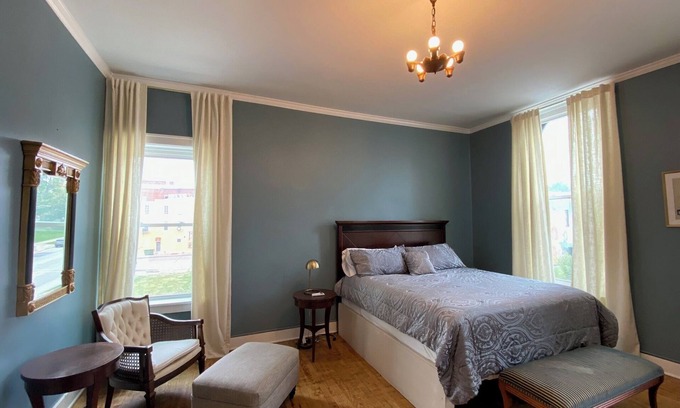 Spacious studio apartment located in historic downtown Hannibal, Missouri. Historic apartment with hardwood floors, high ceilings and all the amenities of home. Walking distance to historic Main Street, shopping, museums, arts, restaurants, and parks. This studio apartment comes fully furnished with full service kitchen and spacious bedroom/living area with king size bed, desk, television, Roku. and seating. Personal heating and cooling unit with remote control dialing and free WiFi. All utilities are included. The perfect home away from home for traveling professionals and nurses. Hannibal Regional Hospital and medical campus is a short drive away and Quincy Medical facilities are 25 minutes away. Explore Sodalis Naturę Trail just a few blocks away, visit the Mark Twain Museum, take a ghost tour, or experience one of our many festivals. Apartment has double key entry for security and free ample parking located behind building. Free shared laundry facilities.
