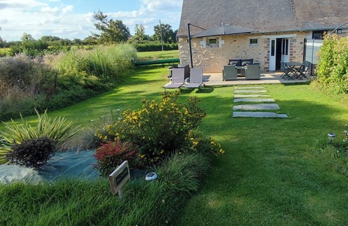South-facing terrace in front of the gîte with garden furniture: table, chairs, lounge and 2 deckchairs, parasol - Charcoal barbecue. Nearby pond 600m².