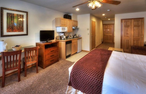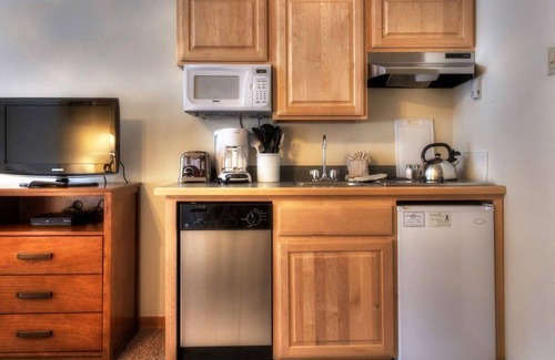 The studio condominiums at Grand Timber Lodge are perfect for a couple or small family. Studio condominiums are well equipped with a kitchenette which includes a mini refrigerator, microwave oven, two-burner stove, and even a mini-dishwasher. Enjoy all of the conveniences of being at home while taking advantage of a 24 hour front desk and all of the amenities Grand Timber Lodge has to offer.